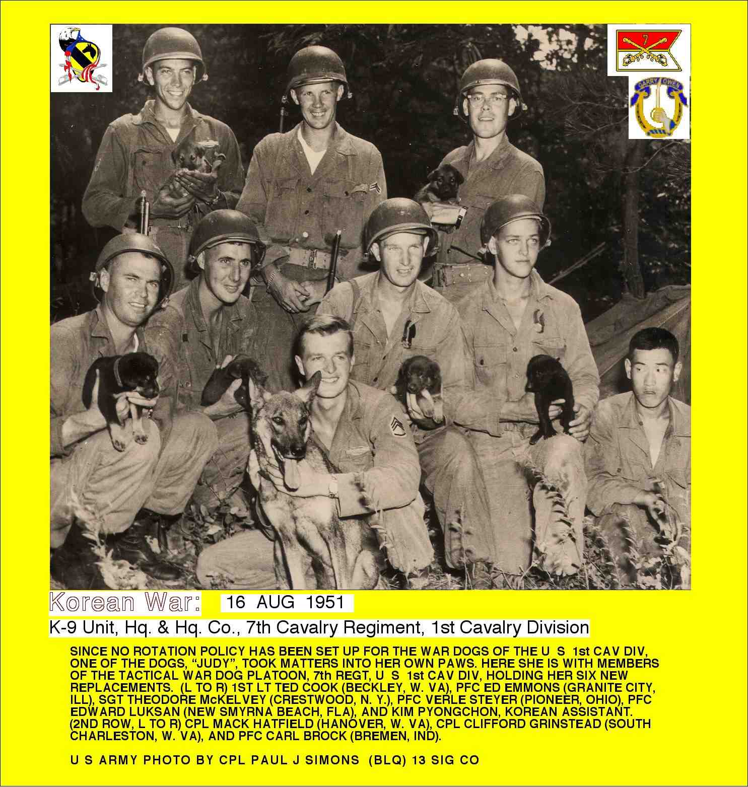 Theodore served as dog handler and eventually was promoted to S/Sgt. when he served as platoon sergeant of his K-9 Unit assigned to the Hq. & Hq. Co., 7th Cavalry Regiment, 1st Cavalry Division. Awarded the Korean Service Medal W/3 Bronze Service Stars and on 8 Jan 1951 received the CIB.